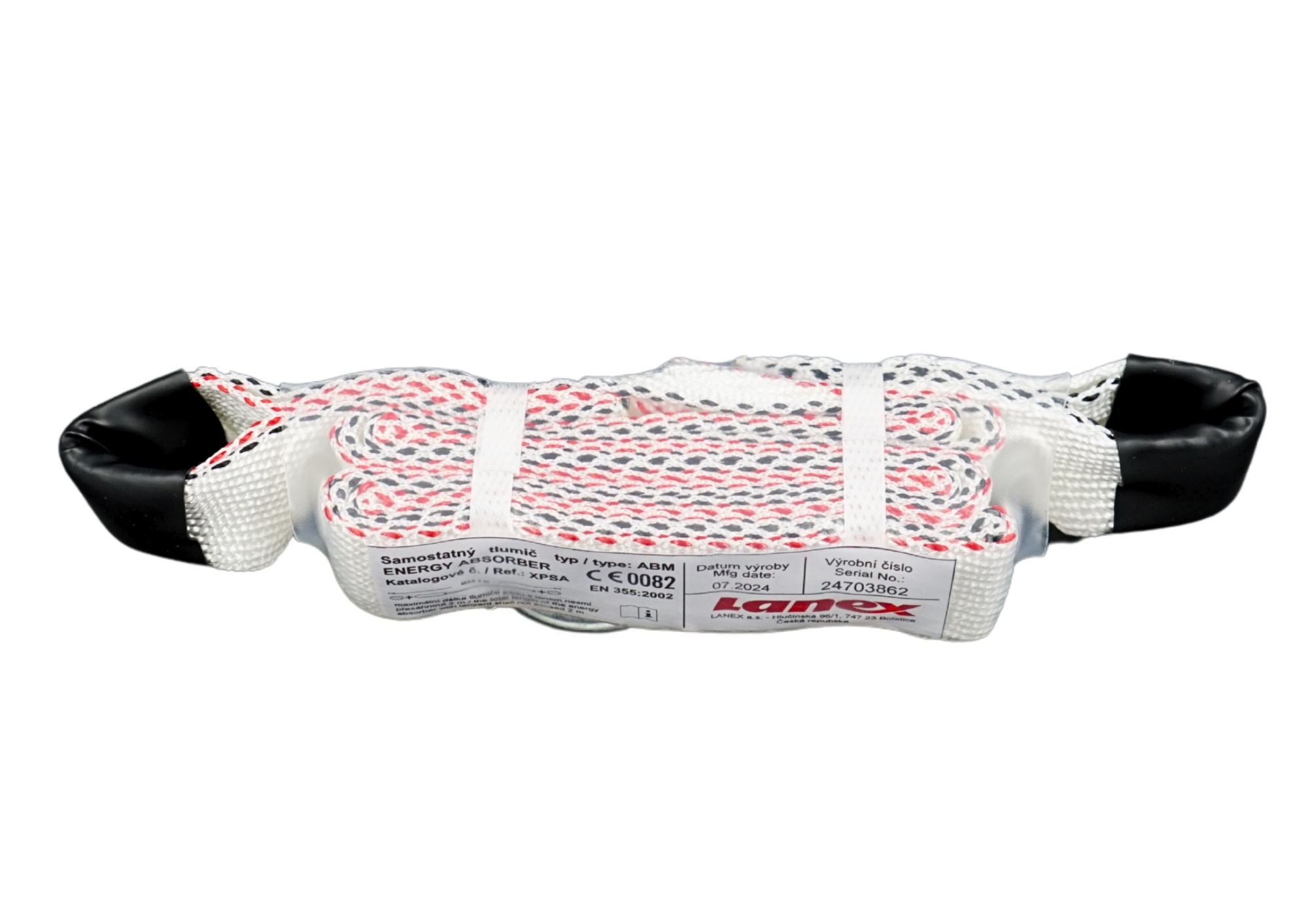 Bezpečnostní tlumič pádu - PES popruh - rozměr tlumiče 230x32x45mm. Maximální délka tlumiče pádu s lanem nesmí přesáhnout 2 m.